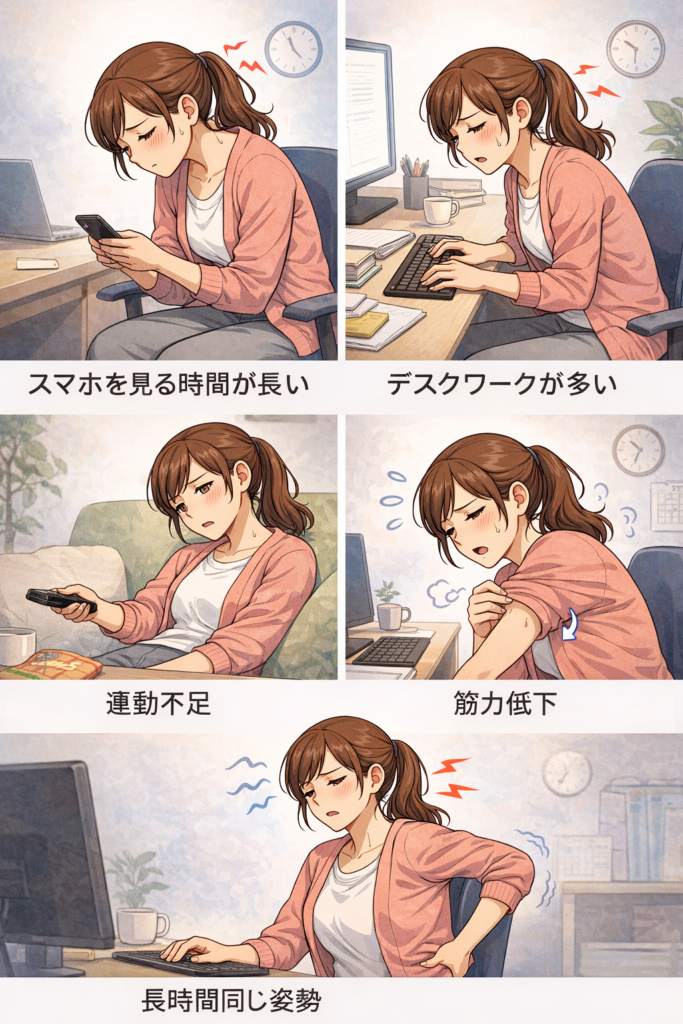 猫背になる原因には、日常生活の習慣が大きく関係しています。
